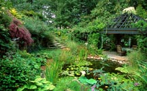 Encompassing a little over an acre, this sophisticated landscape contains a series of themed English and European style gardens abundant with colorful perennials and specimen trees. The dramatic waterfalls, streams and ponds of this multi-level water feature provide focal views from indoors as well as out.
