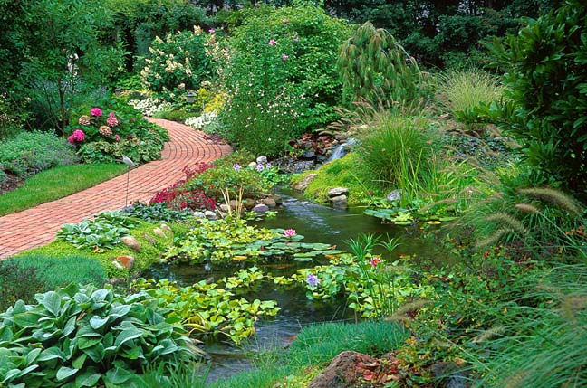 Just off the back terrace is the upper pond, lushly planted and well-populated with a multitude of fish and other water inhabitants. Burgundy and silver foliage and strong textures provide dramatic contrast year-round: ajuga, mazus, lamb's ears and dianthus give carpet to the play of perennials, grasses and evergreens on the water's edge.