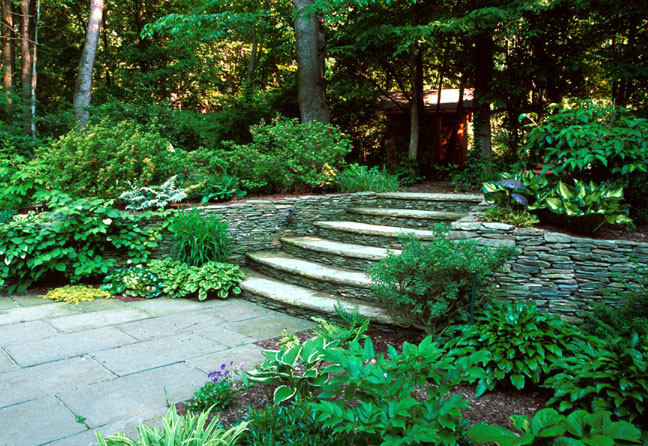From indoors, the owners are drawn out by the sight and sound of water, enticed to dawdle at the edge of the pond surrounded by textures and colors of the abundant plantings. Steps of stone lead upward to the woodland, primarily the realm of the grandchildren. Here, adjacent to the playhouse and swings, is the "Stone Circle," a mystical, artistic arrangement of rocks that encourages climbing, imaginative play, or simple contemplation.